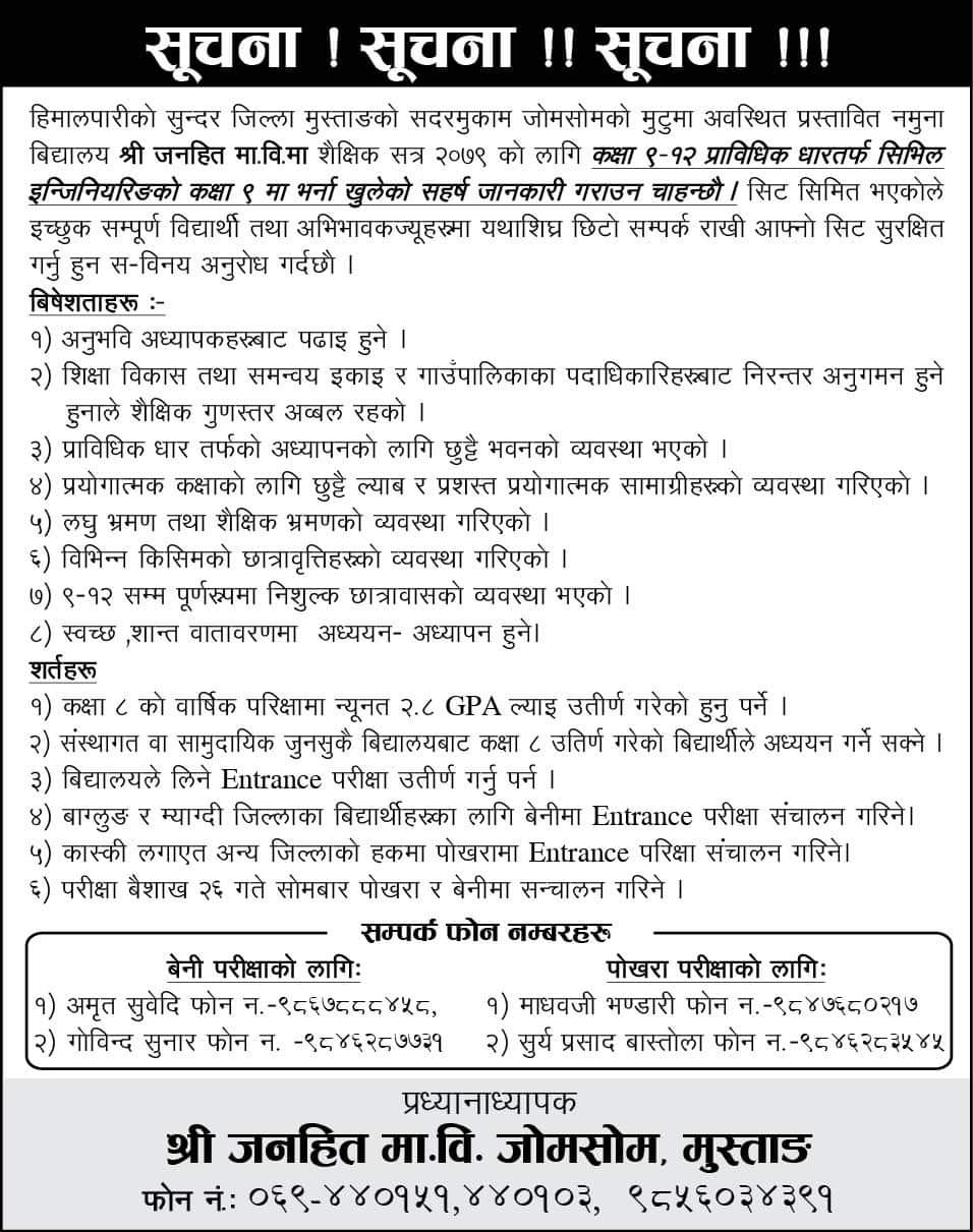 हिमालपारिको जिल्ला मुस्ताङको सदरमुकाम जोमसोममा अवस्थित श्री जनहित माध्यमिक विद्यालय जिल्ला कै नमूना माध्यमिक विद्यालय हो। नमूना विद्यालयको सूचीमा सूचीकृत यस विद्यालयबाट उत्पादित जनशक्ति आज देश तथा विदेशमा उच्च पदमा आसिन भै राष्ट्रको विकासमा लागि परिरहेका छन् । सैदान्तिक भन्दा प्रयोगात्मक शिक्षामा जोड दिने विद्यालयको लक्ष्य एवम् उद्देश्य भएकोले आज विभिन्न जिल्लाका विद्यार्थीहरुको शैक्षिक आकर्षणको गन्तब्य बनेको छ हाम्रो विद्यालय।प्रयोगात्मक गुणस्तरीय तथा ब्यवहारिक शिक्षा आजको आवश्यक्ता भन्ने मूल मर्मलाई आत्मसाथ गर्दै राष्ट्र कै उत्कृष्ठ नमूना विद्यालय विकासको अभियानमा हामीहरु लागि परिरहेका छौ।