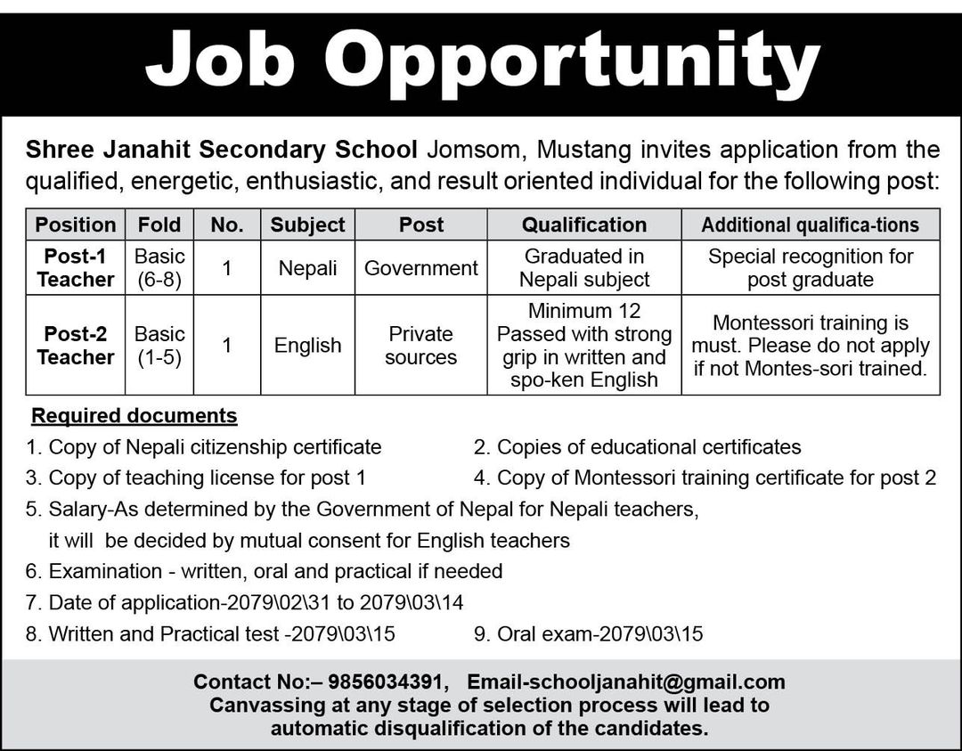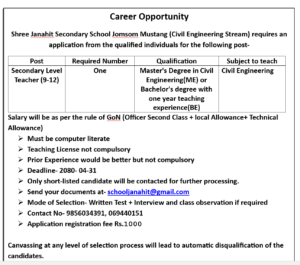 श्री जनहित माध्यमिक विद्यालयमा शिक्षक आवश्यकता